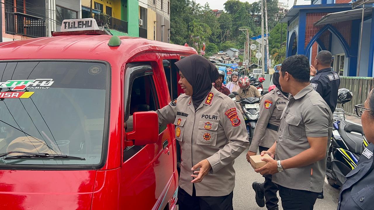 Kegiatan tersebut dipimpin langsung oleh Kabid Humas Polda Maluku Kombes Pol Rositah Umasugi yang turun ke jalan bersama personel Humas dan Propam untuk membagikan takjil secara langsung kepada masyarakat.