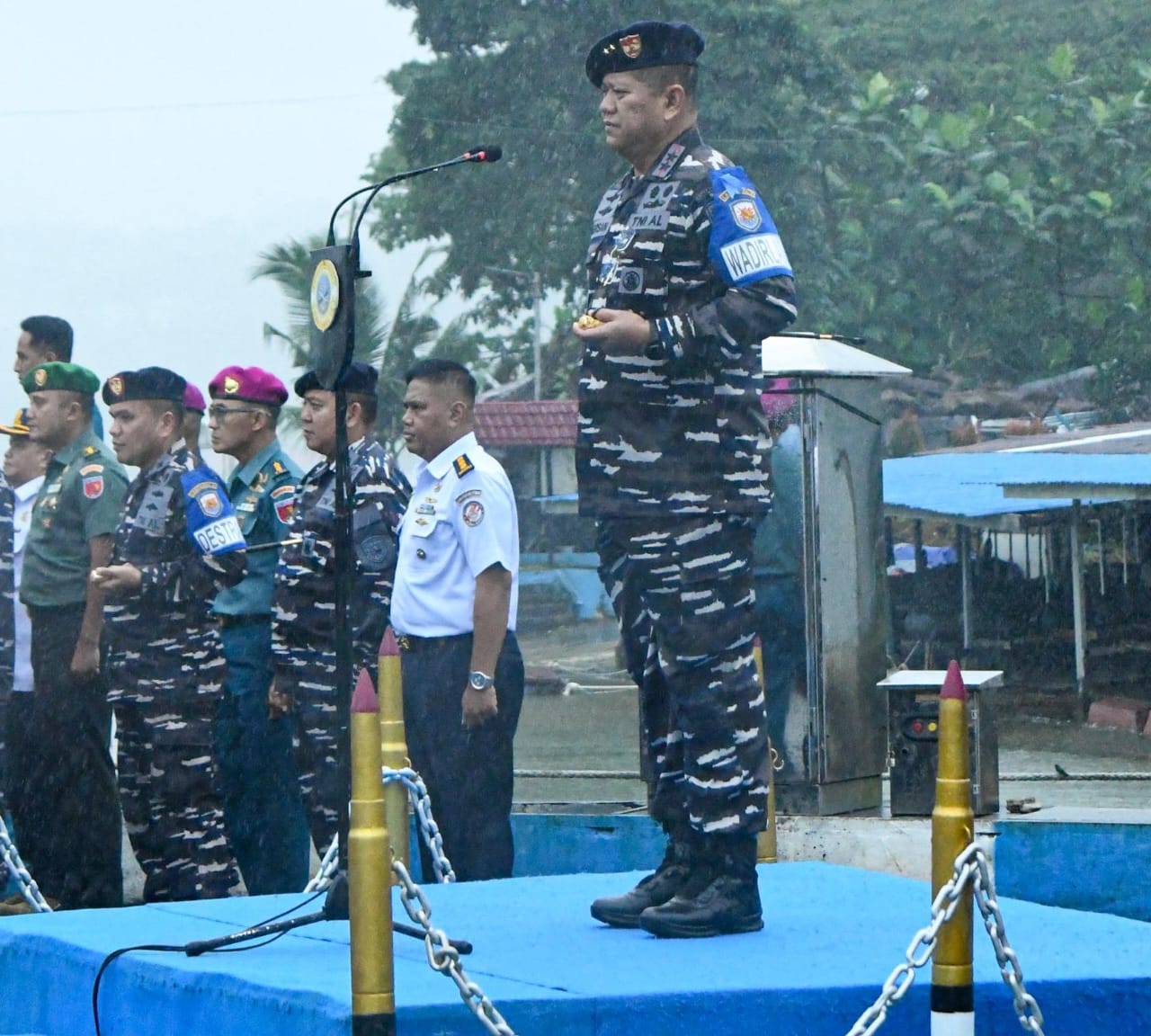 MANGGUREBEMAJU.COM, TNI Angkatan Laut. Pangkalan Utama TNI Angkatan Laut (Lantamal) IX Ambon. Brigadir Jenderal TNI (Mar) Suwandi, S.A.P., M.M., Panglima Komando Armada III (Pangkoarmada III) Laksamana Muda TNI Hersan, S.H., M.Si., memimpin apel gelar pasukan dalam rangka latihan Pencarian dan Penyelamatan (SAR) laka laut 2025 bertempat di Dermaga Irian Lantamal IX Ambon, Halong, Baguala, Kota Ambon, Maluku. Senin (04/08/2025)