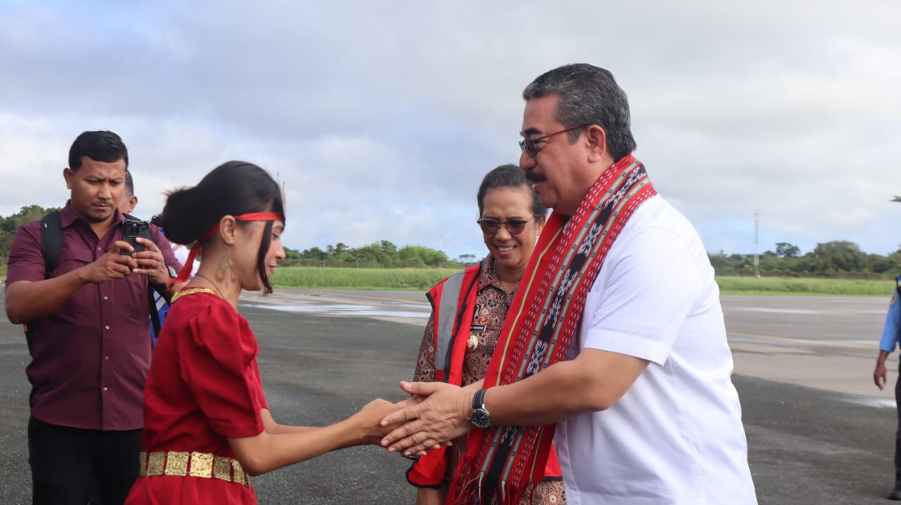 Dengan menggunakan pesawat reguler Wing Air Gubernur dan rombongan tiba di Bandara Udara Mathilda Batlayeri Saumalaki pukul 08.45 WIT dijemput langsung oleh Bupati KKTdan Forkopimda Kabupaten Kepulauan Tanimbar serta disambut dengan pengalungan syal, doa adat dan tarian selamat datang.