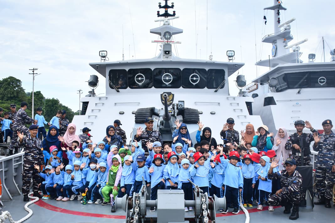 Tiga kapal perang jajaran Satuan Patroli Komando Daerah TNl Angkatan Laut lX (Kodaeral lX), yakni KRI Kerapu-812, KRI Posepa-870 dan KRI Madidihang-855 yang sandar di Dermaga Irian Kodaeral IX Halong, Kota Ambon, Maluku menerima kunjungan edukasi ratusan siswa Raudhatul Athfal As-Salam Ambon pada Kamis (22/1/2026).