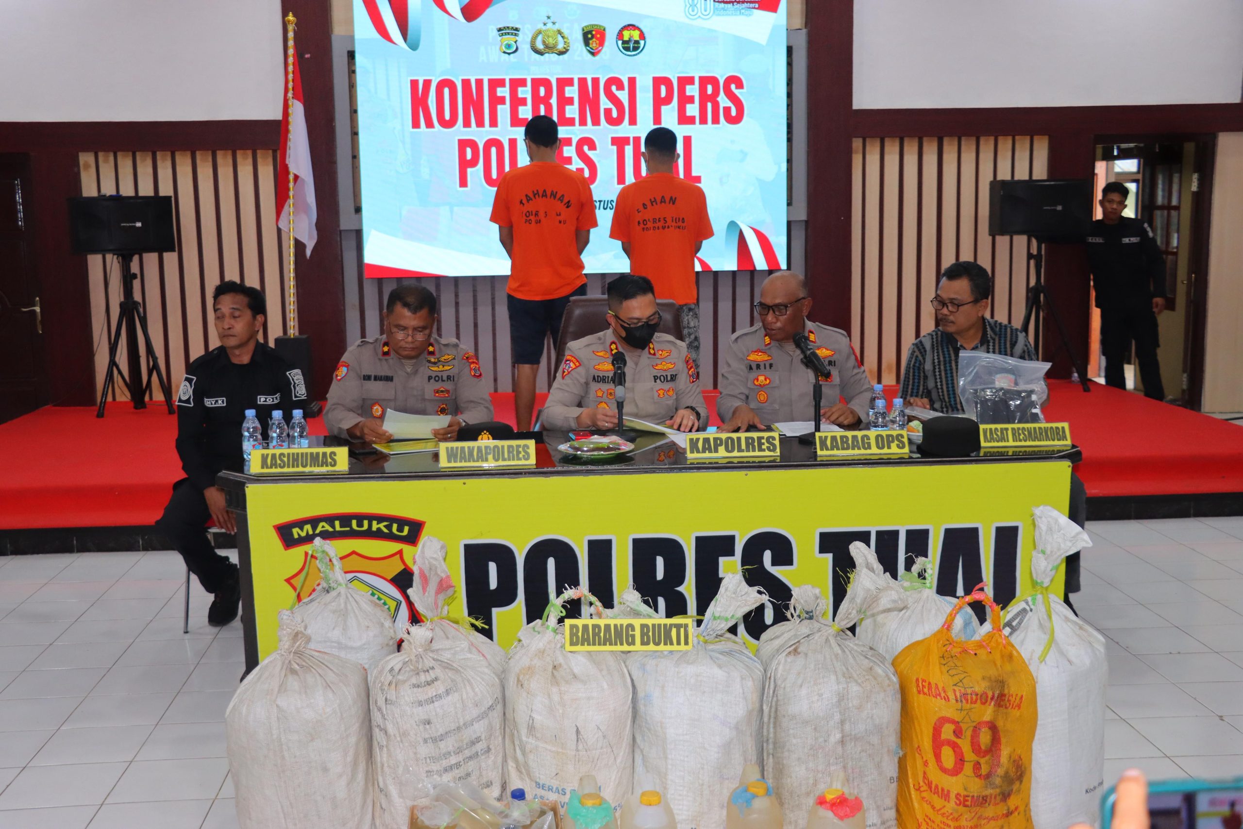 “Untuk mencegah peredaran, polisi menyita barang bukti tersebut dan membawanya ke Ditresnarkoba Polda Maluku untuk proses hukum lebih lanjut,” kata Kapolres Tual AKBP Adrian S.Y. Tuuk, didampingi Wakapolres, Kabag Ops, Kasat Resnarkoba, dan Kasi Humas saat konferensi pers di Aula Jananuraga, Kamis (14/8/2025).