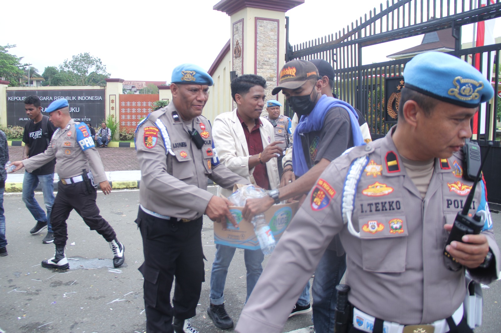 MANGGUREBEMAJU.COM, POLDA MALUKU – Usai pelaksanaan aksi demonstrasi yang digelar oleh Organisasi Kepemudaan (OKP) Cipayung di depan Gerbang Polda Maluku, suasana yang semula tegang berubah menjadi momen kebersamaan yang penuh makna. Beberapa mahasiswa yang terlibat dalam aksi tersebut, bersama dengan personil dari Propam Polda Maluku, terlihat turun ke jalan untuk membersihkan sampah-sampah bekas air mineral, plastik, dan sampah lainnya yang berserakan di sekitar lokasi.