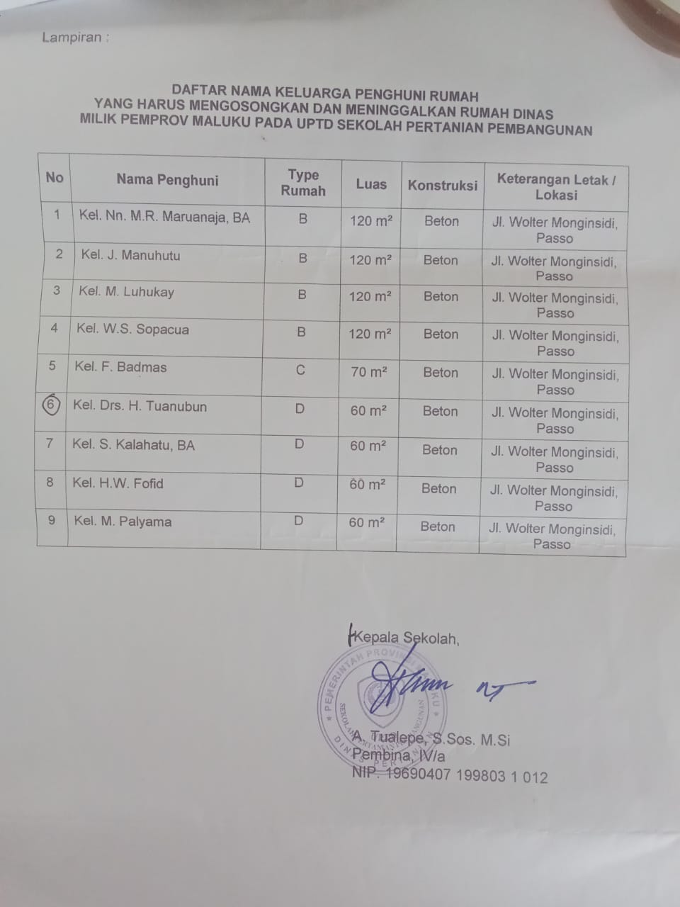 Pihak UPTD SPP meminta seluruh penghuni yang tidak lagi berhak menempati fasilitas tersebut untuk segera “mengosongkan rumah dinas dalam waktu maksimal 1 (satu) bulan” sejak surat diterima. Penegasan ini berlaku bagi pensiunan, keluarga pensiunan, maupun masyarakat umum yang selama ini tinggal di kompleks rumah dinas SPP di “Jalan Wolter Monginsidi, Passo, Ambon”.