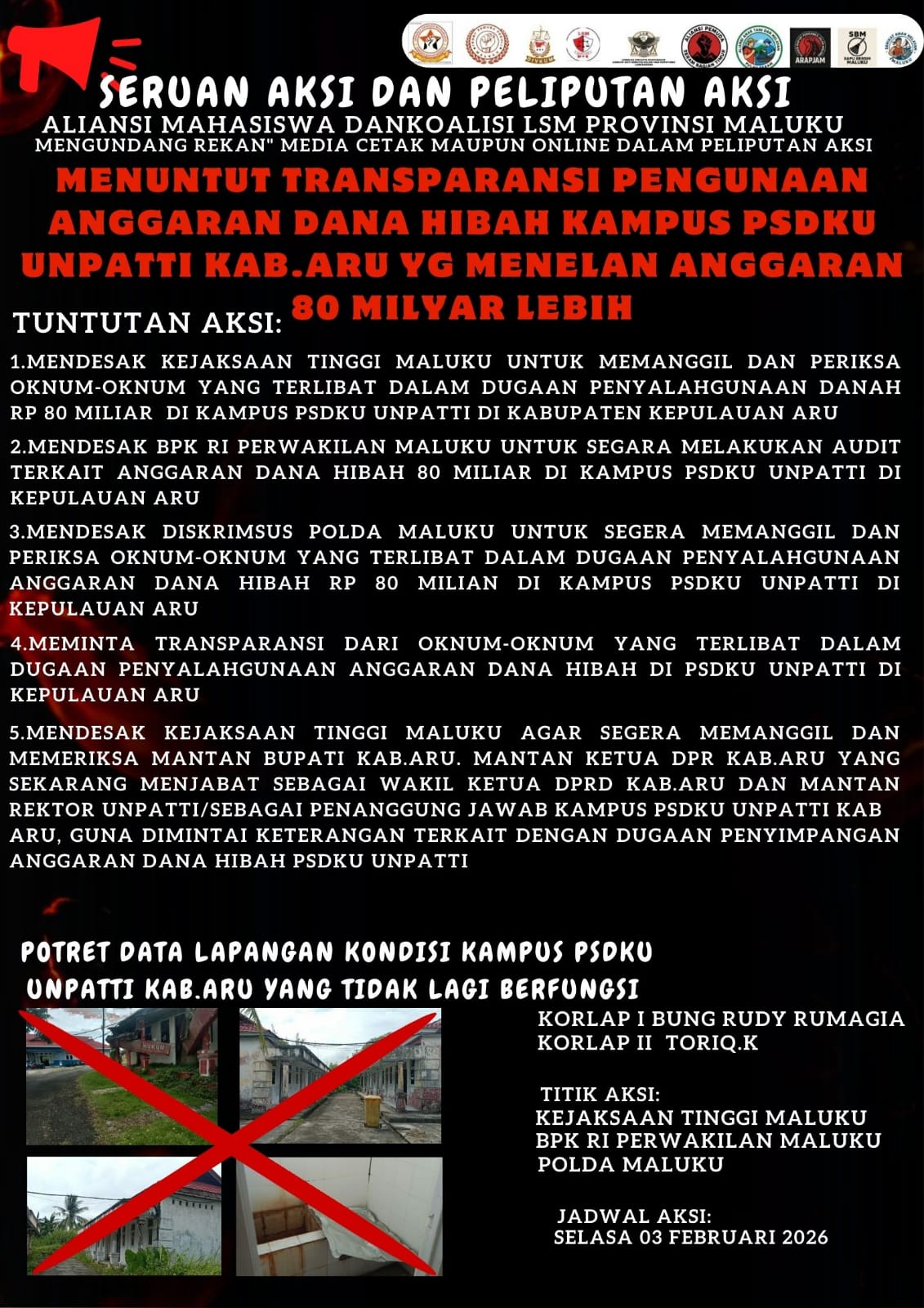 Aliansi Mahasiswa dan Koalisi LSM Provinsi Maluku menyatakan siap “mengguncang” kantor-kantor penegak hukum dalam aksi terbuka sebagai bentuk perlawanan terhadap dugaan penyalahgunaan anggaran negara yang dinilai mencederai dunia pendidikan dan mengkhianati rakyat Aru.