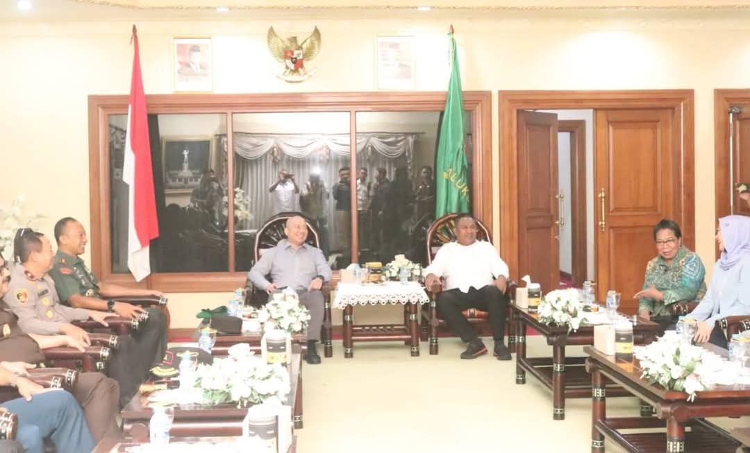 MANGGIREBEMAJU.COM, Wakil Gubernur Maluku, Abdullah Vanath, bersama jajaran Forum Komunikasi Pimpinan Daerah (Forkopimda) Provinsi Maluku, menyambut kedatangan Tim Kunjungan Kerja Spesifik Komisi I DPR RI di Bandara Internasional Pattimura, Laha, Ambon, pada Kamis (1/5/2025).